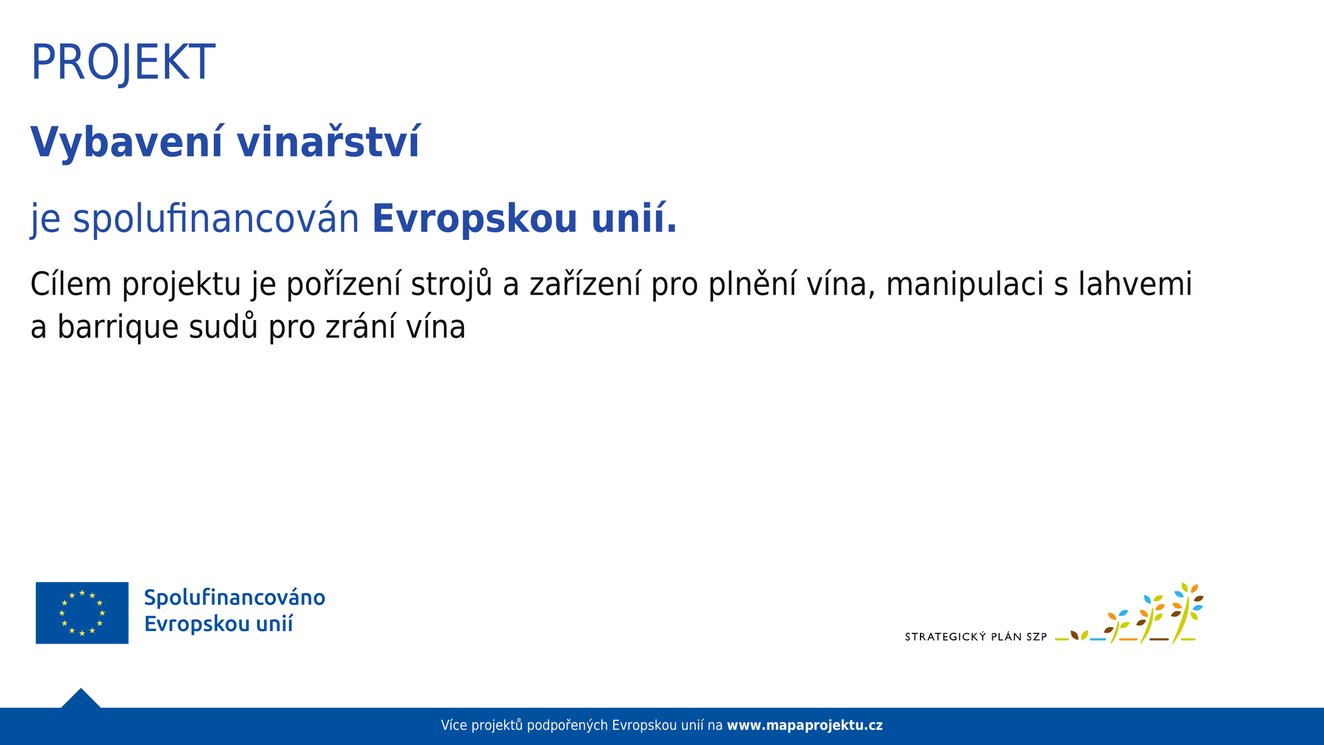 V rámci projektu Vybavení vinařství jsme pořídili elektrický vysokozdvižný vozík, manuální plničku láhví, barrique sudy a kontejnerové klece na víno. Tento projekt je spolufinancován Evropskou unií.